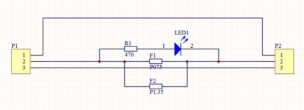 V schéme sú dve poistky (F1 a F2). Použije sa však len F1. F2 je akási náhrada (poistka s vývodmi, preto je na doske vidieť diery). PolySwitch s vývodmi sa neosvedčil, preto sa tieto diery môžu vynechať. Pri spájkovaní kábla, je dobré si dať pozor na to, ktorý koniec, kam pripájame. Prúd tečie od samice k samcovi, preto sa orientujeme podľa priepustnosti diódy (P1 je samica, P2 samec).
