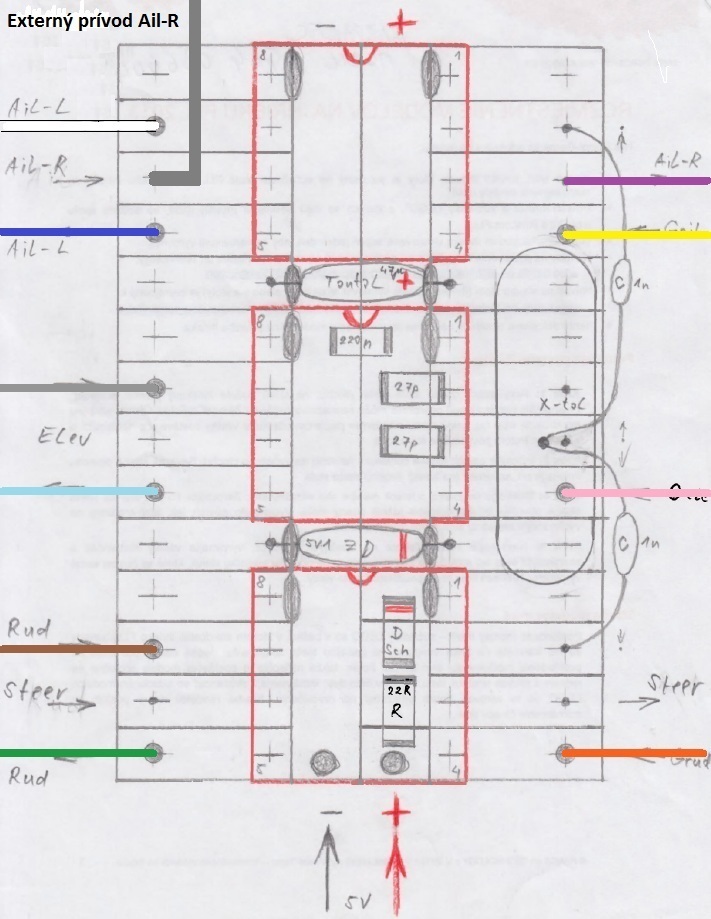 Tam, kde sme hodlali používať samostatné ovládanie obidvoch krídeliek (verzie 4-3-4 a 5-3-5), tak sme museli pripojiť (externý) vstup aj (interný) výstup signálu Ail-R.